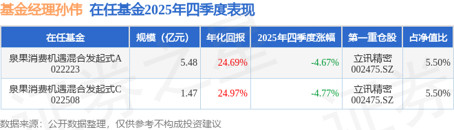证券之星消息,截止2025年四季度末,基金经理孙伟旗下共管理2只基金,本季度表现最佳的为泉果消费机遇混合发起式A(022223),季度净值跌4.67%。
