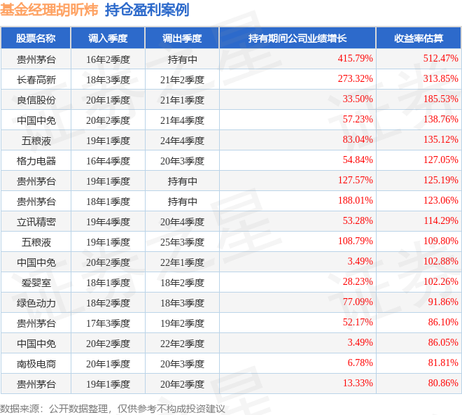 胡昕炜管理的汇添富消费行业混合基金在16年2季度买入贵州茅台,已连续持有9年又2个季度。持有期间的估算收益率为512.47%,持有期间贵州茅台在2016年到2025年的中报归属净利润增幅达415.79%。