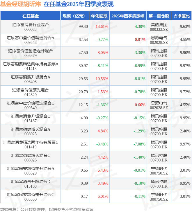 证券之星消息,截止2025年四季度末,基金经理胡昕炜旗下共管理14只基金,本季度表现最佳的为汇添富中盘价值精选混合A(009548),季度净值涨0.81%。