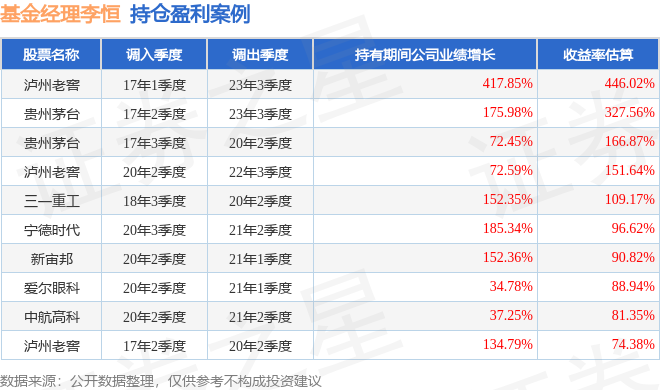 李恒管理的国泰金马稳健混合A基金在17年1季度买入泸州老窖,在持有6年又2个季度后在23年3季度卖出。持有期间的估算收益率为446.02%,持有期间泸州老窖在2017年到2023年的年报归属净利润增幅达417.85%。
