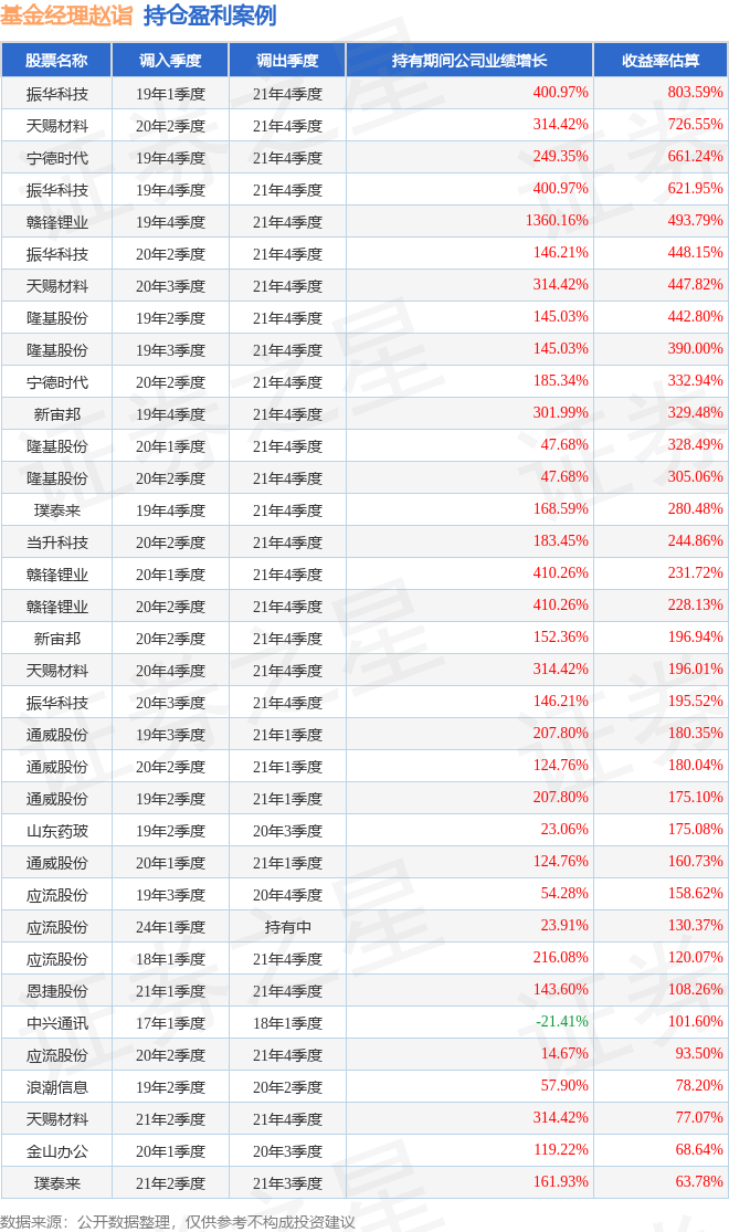 赵诣管理的农银研究精选混合基金在19年1季度买入振华科技,在持有2年又3个季度后在21年4季度卖出。持有期间的估算收益率为803.59%,持有期间振华科技在2019年到2021年的年报归属净利润增幅达400.97%。
