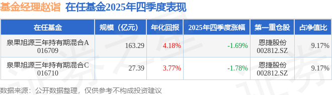 证券之星消息,截止2025年四季度末,基金经理赵诣旗下共管理2只基金,本季度表现最佳的为泉果旭源三年持有期混合A(016709),季度净值跌1.69%。