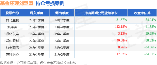 刘盟盟管理的天弘医疗健康混合A基金在22年1季度买入智飞生物,在持有2年又1个季度后在24年2季度卖出。持有期间的估算收益率为-54.94%,持有期间智飞生物在2022年到2024年的年报营业总收入降幅为31.87%。