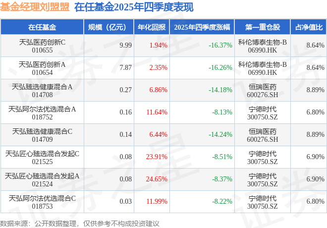 刘盟盟管理的天弘医疗健康混合A基金在19年3季度买入健友股份,在持有1年又0个季度后在20年3季度卖出。持有期间的估算收益率为99.96%,持有期间健友股份在2019年到2020年的年报归属净利润增幅达33.25%。