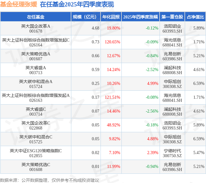 证券之星消息,截止2025年四季度末,基金经理张媛旗下共管理11只基金,本季度表现最佳的为英大碳中和混合A(015724),季度净值涨4.99%。
