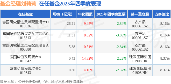 证券之星消息,截止2025年四季度末,基金经理刘莉莉旗下共管理5只基金,本季度表现最佳的为富国价值发现混合A(019342),季度净值跌2.22%。