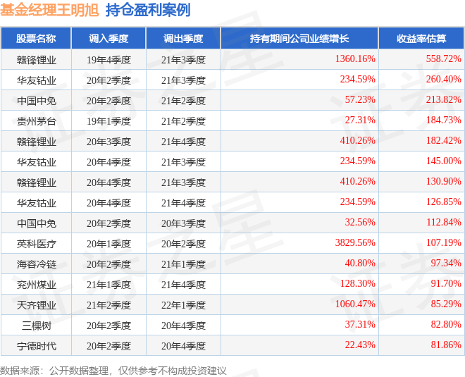 王明旭管理的广发内需增长混合A基金在19年4季度买入赣锋锂业,在持有1年又3个季度后在21年3季度卖出。持有期间的估算收益率为558.72%,持有期间赣锋锂业在2019年到2021年的年报归属净利润增幅达1360.16%。