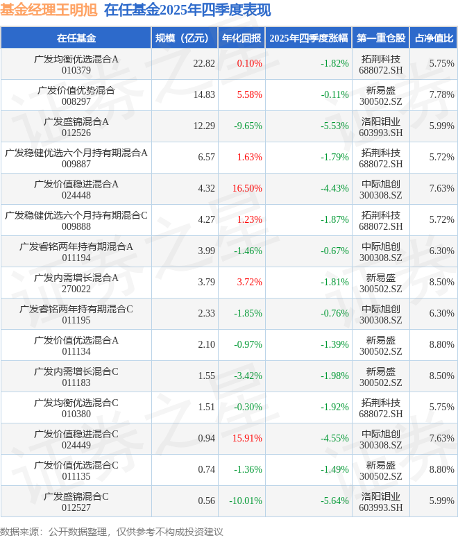 证券之星消息,截止2025年四季度末,基金经理王明旭旗下共管理15只基金,本季度表现最佳的为广发价值优势混合(008297),季度净值跌0.11%。
