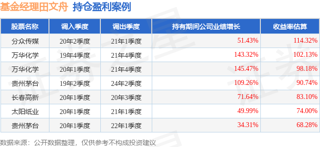 田文舟管理的广发成长新动能混合A基金在20年1季度买入万华化学,在持有1年又3个季度后在21年4季度卖出。持有期间的估算收益率为98.18%,持有期间万华化学在2020年到2021年的年报归属净利润增幅达145.47%。