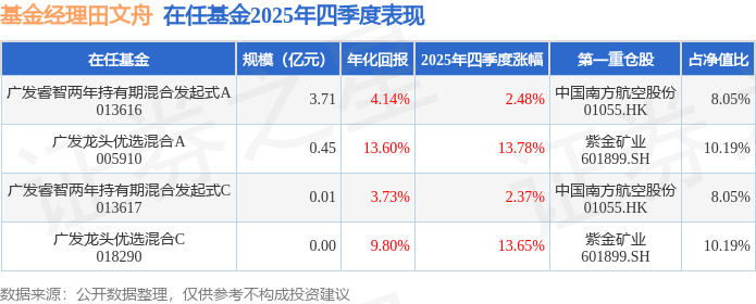 田文舟管理的广发龙头优选混合A基金在23年4季度买入紫金矿业,已连续持有2年又0个季度。持有期间的估算收益率为-82.11%,持有期间紫金矿业在2023年到2025年的中报归属净利润增幅达126.09%。