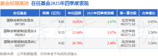 证券之星消息,截止2025年四季度末,基金经理高诗旗下共管理3只基金,本季度表现最佳的为国联安智能制造混合A(006863),季度净值涨2.67%。