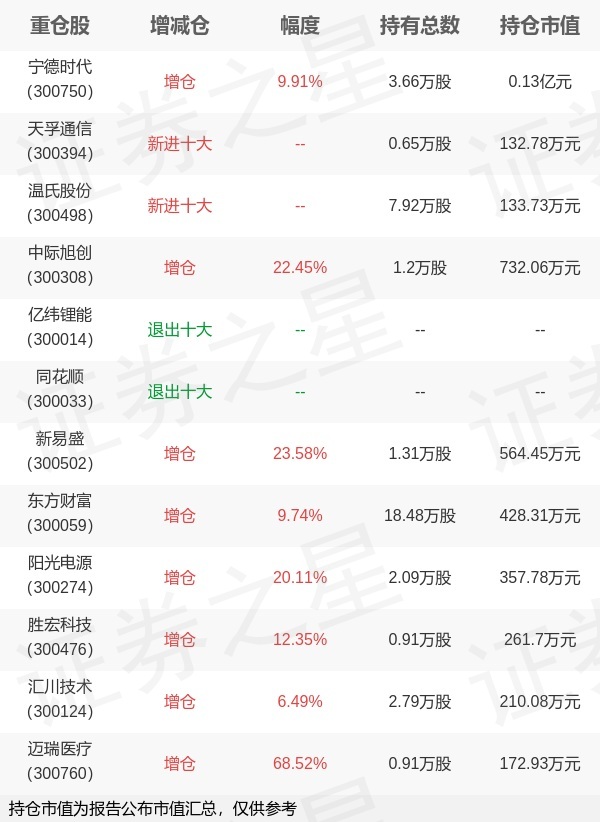 证券之星消息,1月22日天弘基金旗下林心龙 洪明华管理的天弘创业板交易型开放式指数基金联接基金公布年报,近1年净值增长率54.28%。与上一季度相比,该基金前十大重仓股新增天孚通信,温氏股份;并对宁德时代增仓0.33万股,为该基金第一大重仓股;亿纬锂能,同花顺等退出前十大重仓股;详细数据如下: