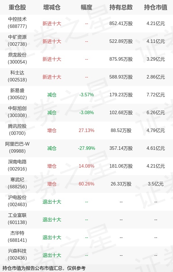 证券之星消息,1月22日汇添富基金旗下马翔管理的汇添富科技创新灵活配置混合型基金公布年报,近1年净值增长率93.35%。与上一季度相比,该基金前十大重仓股新增中控技术,中矿资源,鼎龙股份,科士达;其中新易盛持仓占比6.97%,为该基金第一大重仓股;沪电股份,工业富联,杰华特,兴森科技等退出前十大重仓股;详细数据如下:
