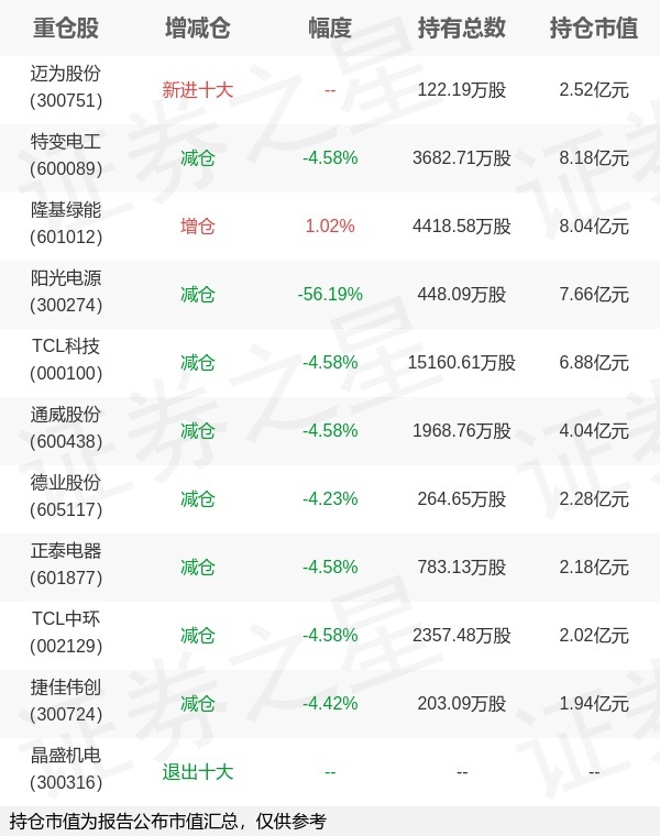 证券之星消息,1月22日天弘基金旗下祁世超管理的天弘中证光伏产业指数型发起式基金公布年报,近1年净值增长率41.77%。与上一季度相比,该基金前十大重仓股新增迈为股份;其中特变电工持仓占比9.32%,为该基金第一大重仓股;晶盛机电等退出前十大重仓股;详细数据如下: