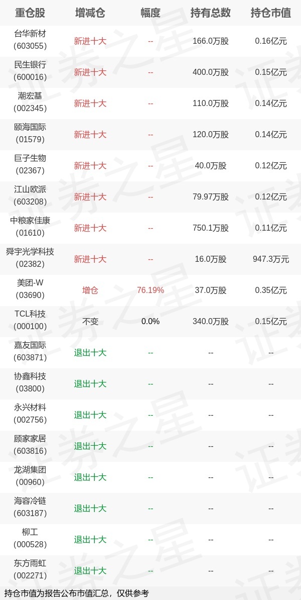 证券之星消息,1月22日华夏基金旗下张海静 刘明宇管理的华夏卓信一年定期开放债券型发起式基金公布年报,近1年净值增长率3.74%。与上一季度相比,该基金前十大重仓股新增台华新材,民生银行,潮宏基,颐海国际,巨子生物,江山欧派,中粮家佳康,舜宇光学科技;并对美团-W增仓16.0万股,为该基金第一大重仓股;嘉友国际,协鑫科技,永兴材料,顾家家居,龙湖集团,海容冷链,柳工,东方雨虹等退出前十大重仓股;详细数据如下: