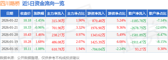 证券之星消息,截至2026年1月22日收盘,四川路桥(600039)报收于10.18元,下跌1.45%,换手率0.19%,成交量16.23万手,成交额1.66亿元。