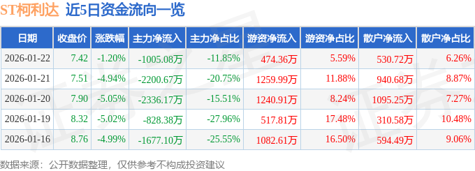 证券之星消息,截至2026年1月22日收盘,ST柯利达(603828)报收于7.42元,下跌1.2%,换手率1.93%,成交量11.52万手,成交额8479.43万元。