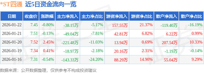 证券之星消息,截至2026年1月22日收盘,*ST四通(603838)报收于7.45元,下跌0.8%,换手率0.31%,成交量9846.0手,成交额737.44万元。