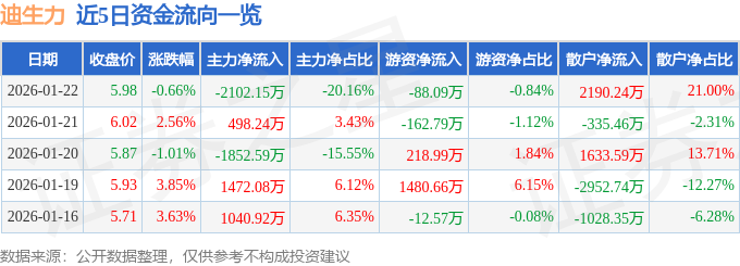 证券之星消息,截至2026年1月22日收盘,迪生力(603335)报收于5.98元,下跌0.66%,换手率4.06%,成交量17.37万手,成交额1.04亿元。