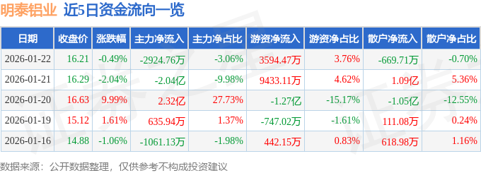 证券之星消息,截至2026年1月22日收盘,明泰铝业(601677)报收于16.21元,下跌0.49%,换手率4.83%,成交量58.84万手,成交额9.55亿元。