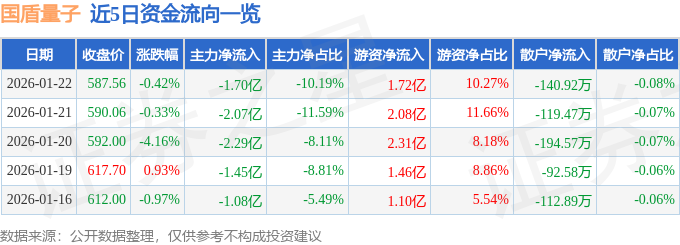 证券之星消息,截至2026年1月22日收盘,国盾量子(688027)报收于587.56元,下跌0.42%,换手率3.55%,成交量2.85万手,成交额16.72亿元。