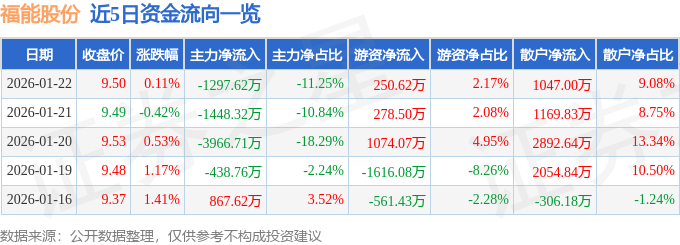 证券之星消息,截至2026年1月22日收盘,福能股份(600483)报收于9.5元,上涨0.11%,换手率0.44%,成交量12.15万手,成交额1.15亿元。