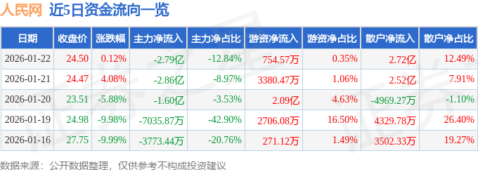 证券之星消息,截至2026年1月22日收盘,人民网(603000)报收于24.5元,上涨0.12%,换手率7.91%,成交量87.41万手,成交额21.74亿元。