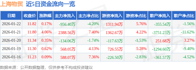证券之星消息,截至2026年1月22日收盘,上海物贸(600822)报收于11.82元,上涨0.17%,换手率4.85%,成交量19.22万手,成交额2.28亿元。