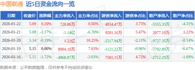 证券之星消息,截至2026年1月22日收盘,中国联通(600050)报收于5.09元,上涨0.2%,换手率0.82%,成交量252.44万手,成交额12.88亿元。