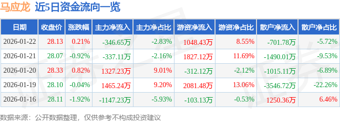 证券之星消息,截至2026年1月22日收盘,马应龙(600993)报收于28.13元,上涨0.21%,换手率1.02%,成交量4.37万手,成交额1.23亿元。