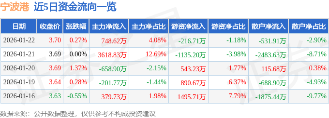 证券之星消息,截至2026年1月22日收盘,宁波港(601018)报收于3.7元,上涨0.27%,换手率0.26%,成交量49.71万手,成交额1.83亿元。