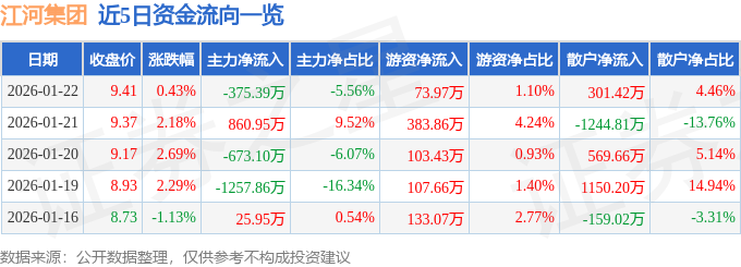 证券之星消息,截至2026年1月22日收盘,江河集团(601886)报收于9.41元,上涨0.43%,换手率0.64%,成交量7.21万手,成交额6752.98万元。