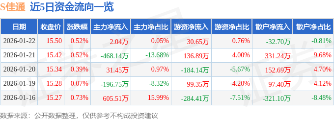 证券之星消息,截至2026年1月22日收盘,S佳通(600182)报收于15.5元,上涨0.52%,换手率1.54%,成交量2.61万手,成交额4039.06万元。