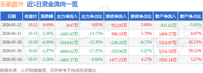 证券之星消息,截至2026年1月22日收盘,乐凯胶片(600135)报收于10.22元,上涨0.69%,换手率3.23%,成交量17.89万手,成交额1.82亿元。