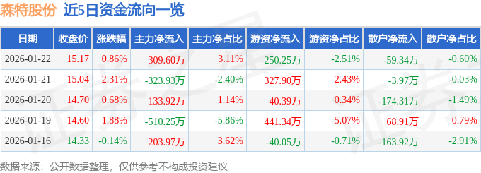证券之星消息,截至2026年1月22日收盘,森特股份(603098)报收于15.17元,上涨0.86%,换手率1.23%,成交量6.62万手,成交额9951.65万元。