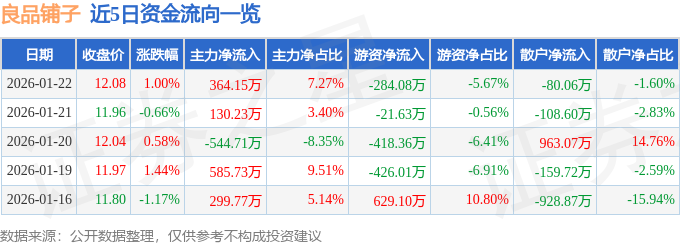 证券之星消息,截至2026年1月22日收盘,良品铺子(603719)报收于12.08元,上涨1.0%,换手率1.04%,成交量4.16万手,成交额5009.58万元。
