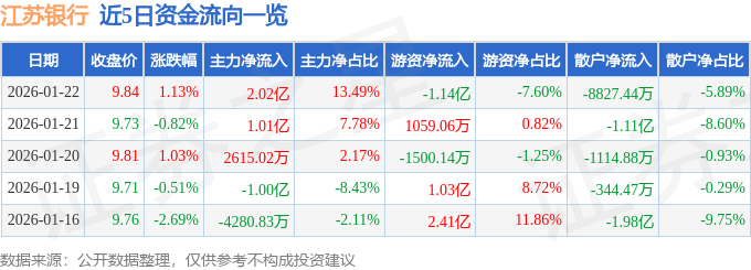 证券之星消息,截至2026年1月22日收盘,江苏银行(600919)报收于9.84元,上涨1.13%,换手率0.83%,成交量152.18万手,成交额15.0亿元。
