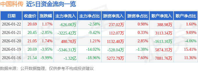 证券之星消息,截至2026年1月22日收盘,中国科传(601858)报收于20.69元,上涨1.17%,换手率1.48%,成交量11.72万手,成交额2.42亿元。