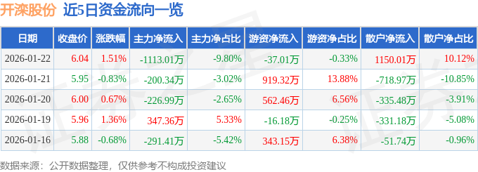 证券之星消息,截至2026年1月22日收盘,开滦股份(600997)报收于6.04元,上涨1.51%,换手率1.19%,成交量18.88万手,成交额1.14亿元。