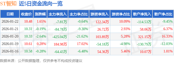 证券之星消息,截至2026年1月22日收盘,ST智知(603869)报收于10.48元,上涨1.65%,换手率0.24%,成交量1.17万手,成交额1212.23万元。