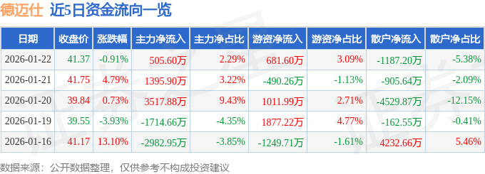 证券之星消息,截至2026年1月22日收盘,德迈仕(301007)报收于41.37元,下跌0.91%,换手率3.48%,成交量5.33万手,成交额2.21亿元。
