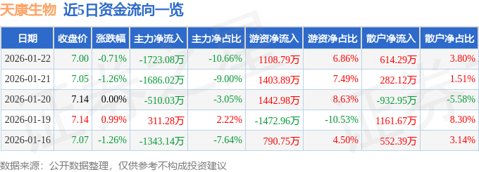 证券之星消息,截至2026年1月22日收盘,天康生物(002100)报收于7.0元,下跌0.71%,换手率1.69%,成交量23.05万手,成交额1.62亿元。