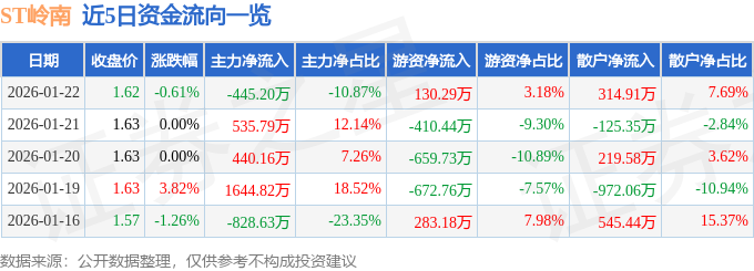 证券之星消息,截至2026年1月22日收盘,ST岭南(002717)报收于1.62元,下跌0.61%,换手率1.57%,成交量25.32万手,成交额4097.31万元。