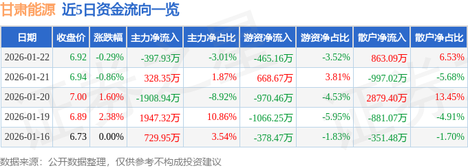 证券之星消息,截至2026年1月22日收盘,甘肃能源(000791)报收于6.92元,下跌0.29%,换手率0.99%,成交量19.13万手,成交额1.32亿元。