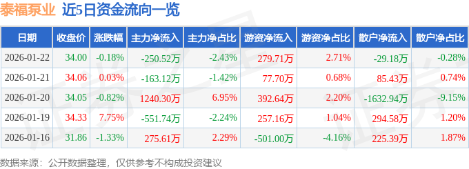 证券之星消息,截至2026年1月22日收盘,泰福泵业(300992)报收于34.0元,下跌0.18%,换手率3.95%,成交量3.06万手,成交额1.03亿元。