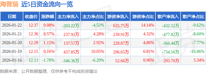 证券之星消息,截至2026年1月22日收盘,海普瑞(002399)报收于12.37元,上涨0.08%,换手率0.29%,成交量3.63万手,成交额4496.07万元。