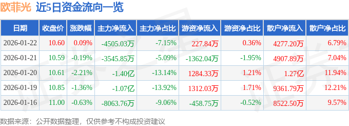 证券之星消息,截至2026年1月22日收盘,欧菲光(002456)报收于10.6元,上涨0.09%,换手率1.79%,成交量59.26万手,成交额6.3亿元。