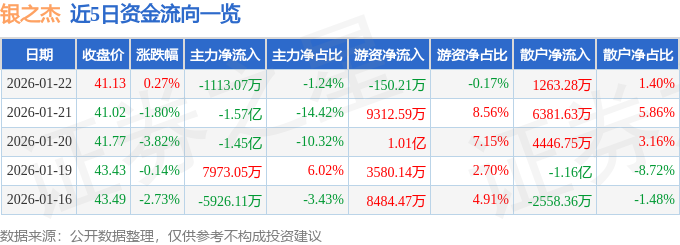 证券之星消息,截至2026年1月22日收盘,银之杰(300085)报收于41.13元,上涨0.27%,换手率3.35%,成交量21.84万手,成交额9.0亿元。