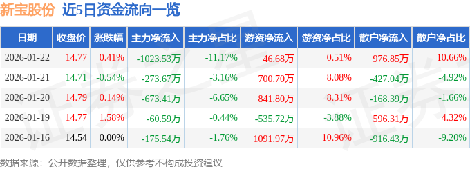 证券之星消息,截至2026年1月22日收盘,新宝股份(002705)报收于14.77元,上涨0.41%,换手率0.77%,成交量6.21万手,成交额9164.83万元。