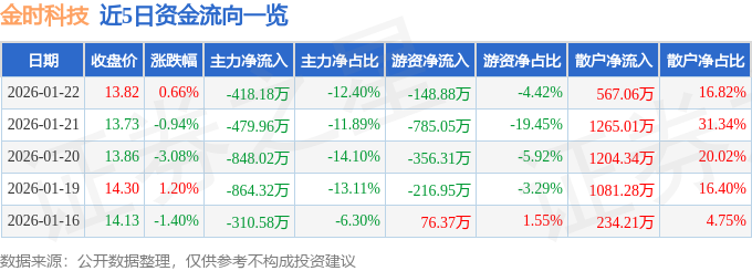 证券之星消息,截至2026年1月22日收盘,金时科技(002951)报收于13.82元,上涨0.66%,换手率0.61%,成交量2.44万手,成交额3371.5万元。